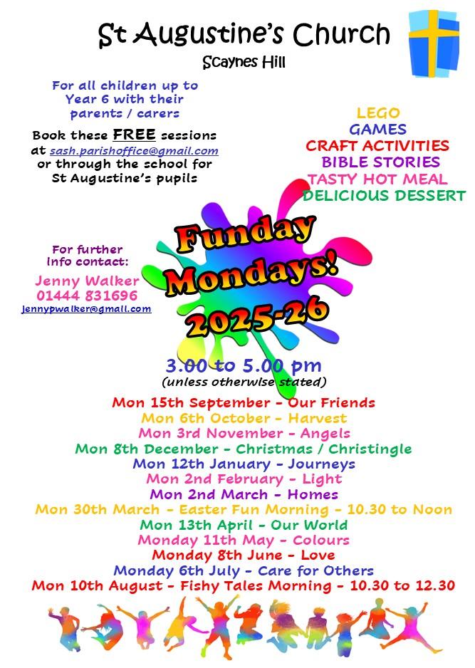 For all children up to Year 6 with their parents/carers there will be Lego, Games, Craft Activities, Bible Stories, Tasty Hot Meal and Delicious Dessert.  This month the theme is 'Angels'. Book this FREE session at sash.parishoffice@gmail.com or through the school for St. Augustine's pupils.  For further information contact Jenny Walker on jennypwalker@gmail.com or 01444-831696.